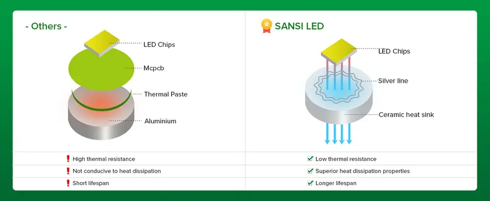 PATENTERT KERAMISK TEKNOLOGI: Chip on Ceramic, SANSIs patenterte teknologi erstatter det tradisjonelle Mcpcb aluminiumsubstratet med en ikke-ledende keramisk varmespreder, og lodder LED-brikken direkte på den keramiske varmesprederen, noe som effektivt reduserer systemets termiske motstand mellom LED PN-junction og overflaten av varmesprederen, noe som resulterer i raskere varmeledning og høyere produktpålitelighet, og produserer en SANSI-pære med høyere lysutbytte.